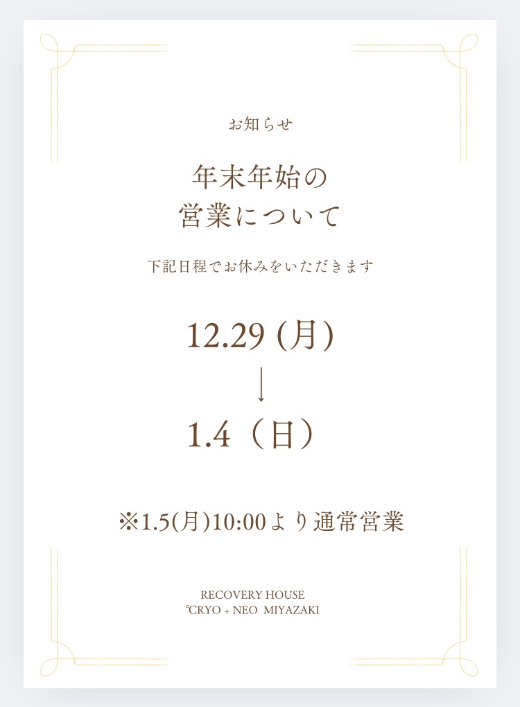 RECOVERY HOUSE°CRYO+ NEO MIYAZAKIをご利用いただきありがとうございます。